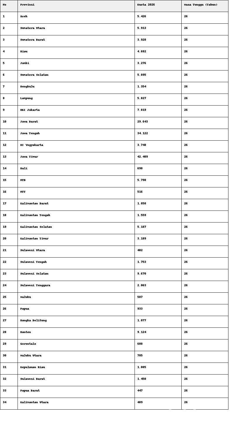 Pemerintah juga menetapkan bahwa waktu tunggu (waiting list) untuk pendaftaran haji tahun 2026 diseragamkan menjadi 26 tahun di seluruh provinsi. Kebijakan ini berbeda dengan tahun 2025 sebelumnya, di mana masa tunggu antarprovinsi sangat bervariasi, bahkan mencapai 47 tahun di beberapa daerah.